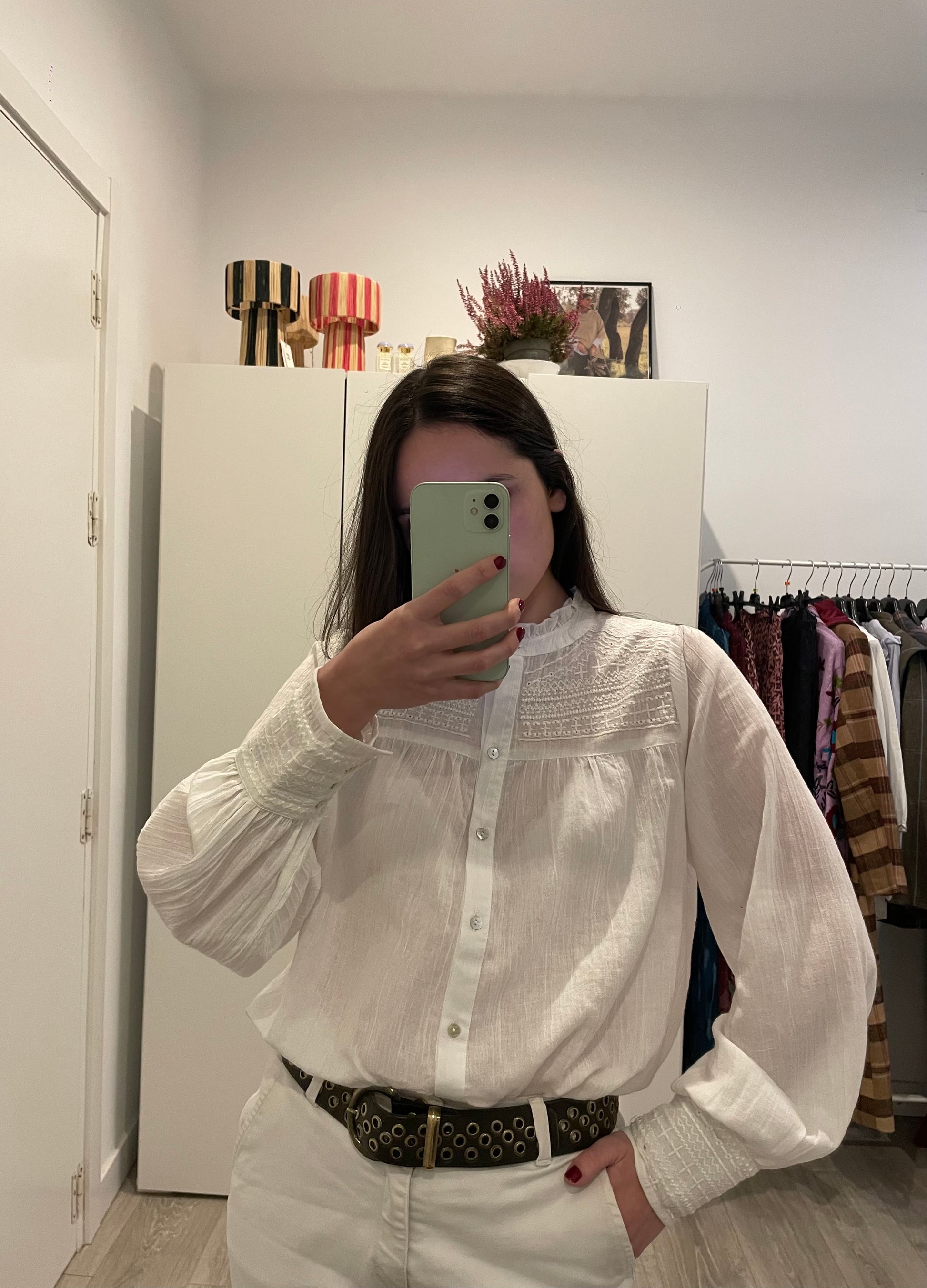 Blusa con detalles bordados en las mangas y en la parte delantera en color blanco.