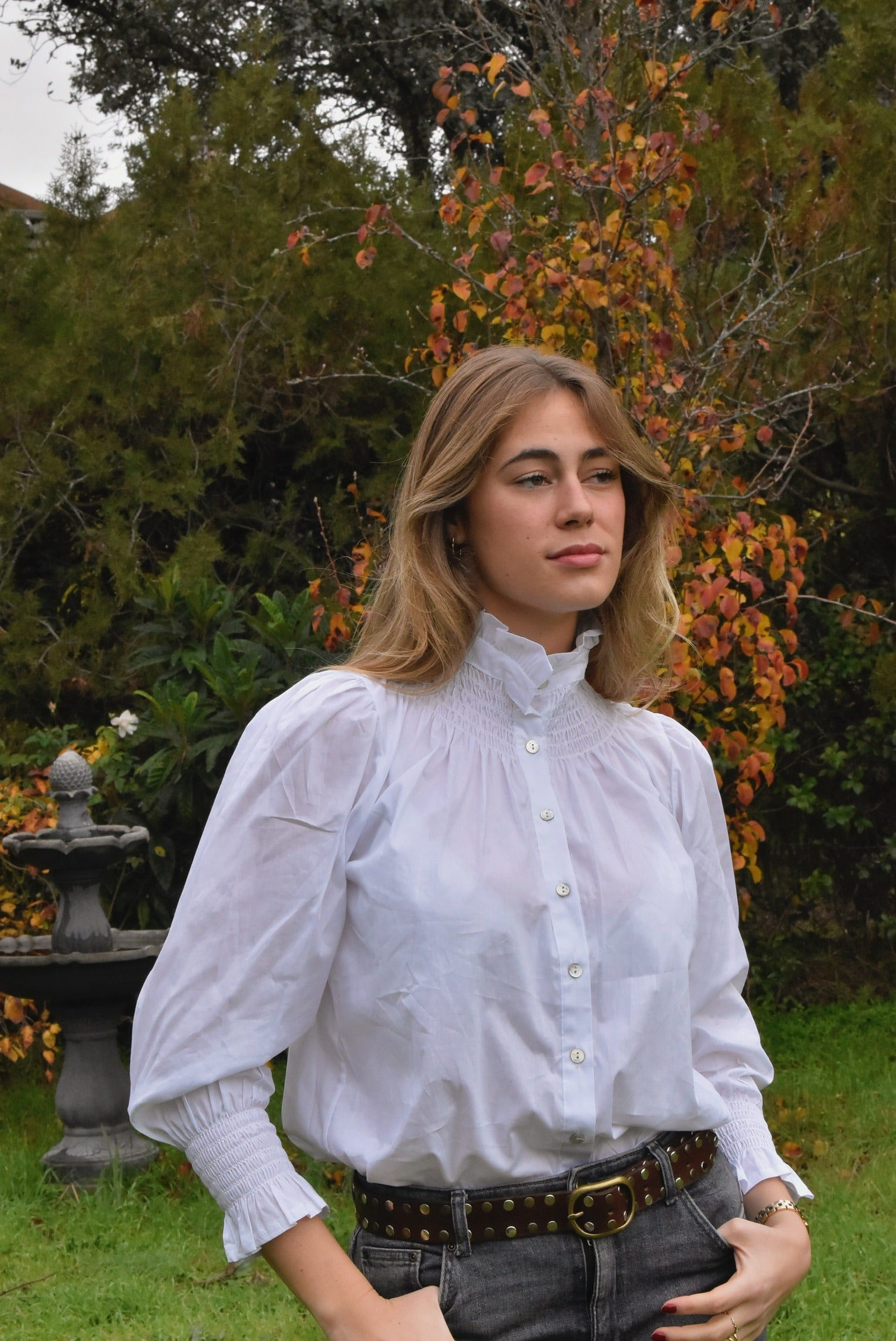 Blusa con detalles de nido de abeja en las mangas y cuello.