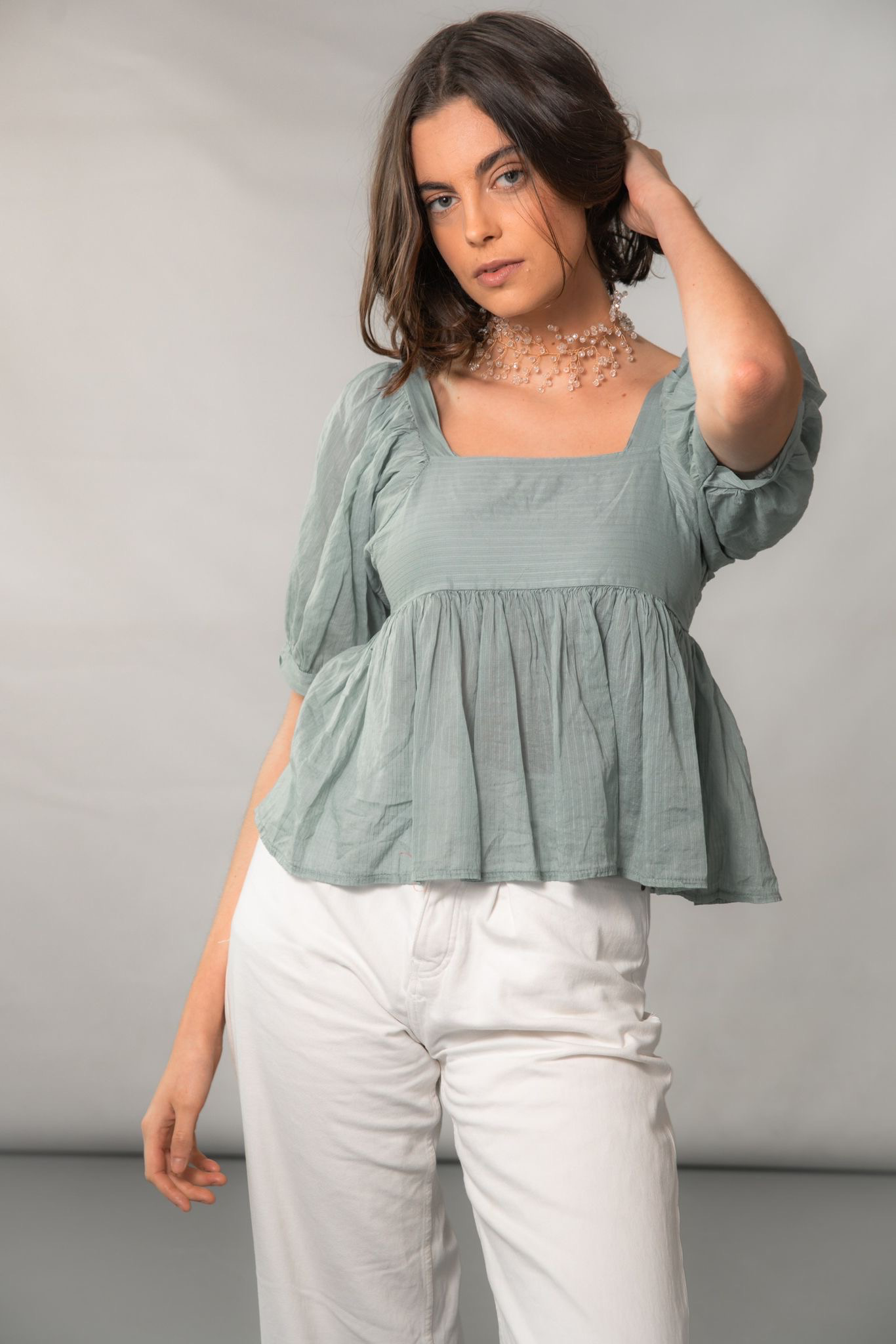 Blusa manga abullonada disponible en varios colores.