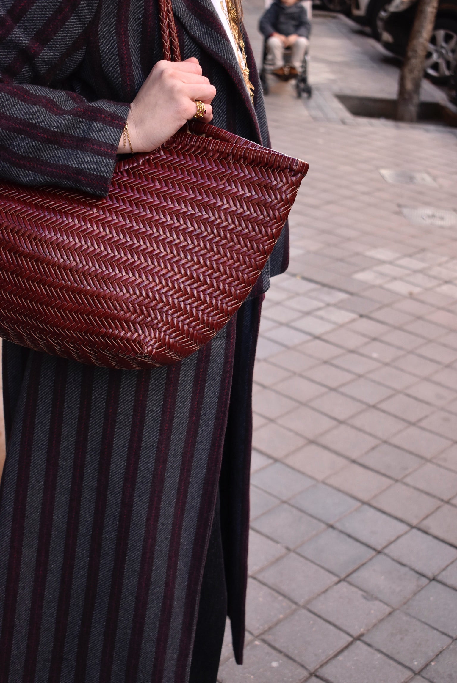 Bolso de rafia con bolsita interior disponible en color granate o marrón chocolate.
