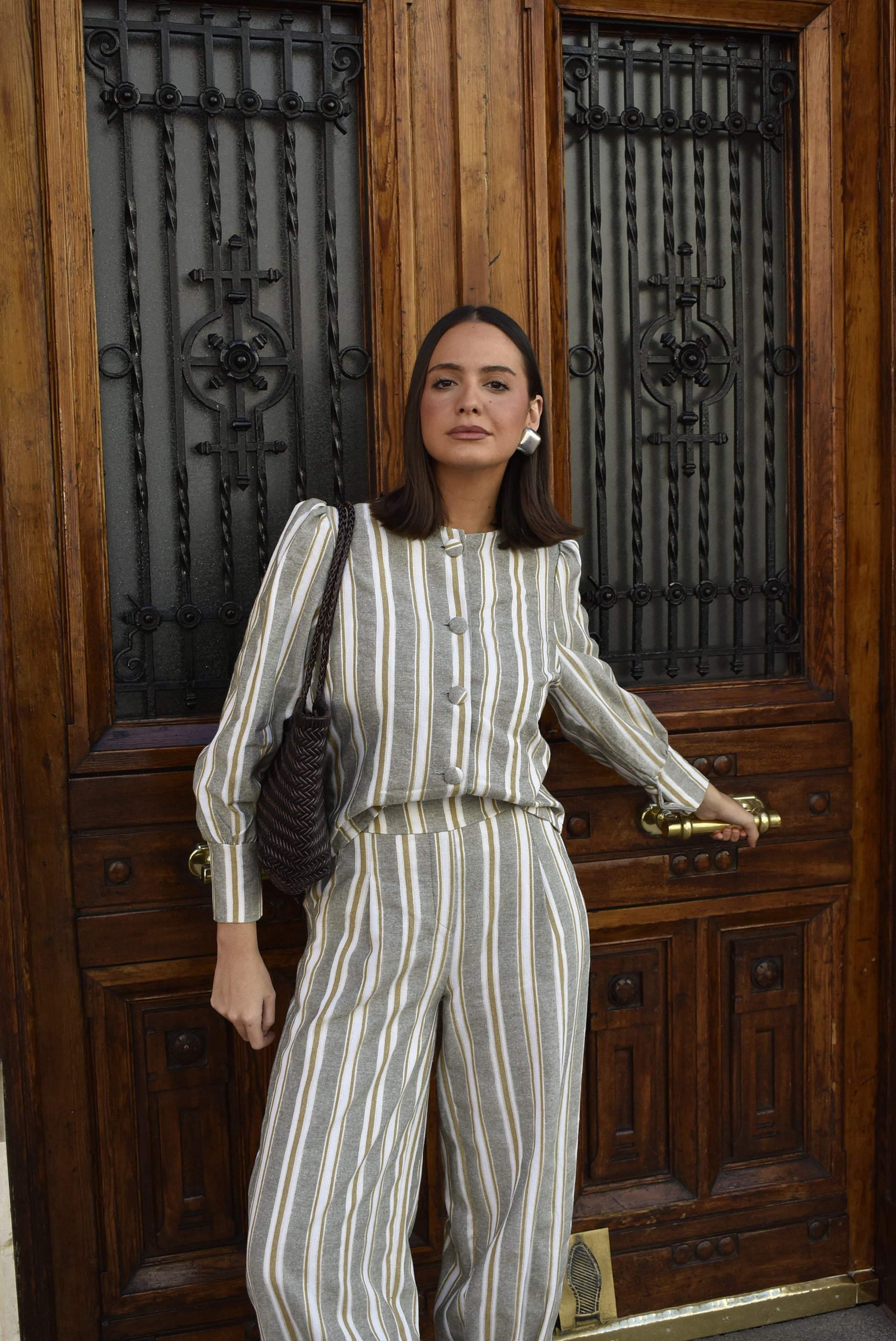 Chaqueta de rayas beige y gris con mangas abullonadas y botones forrados.