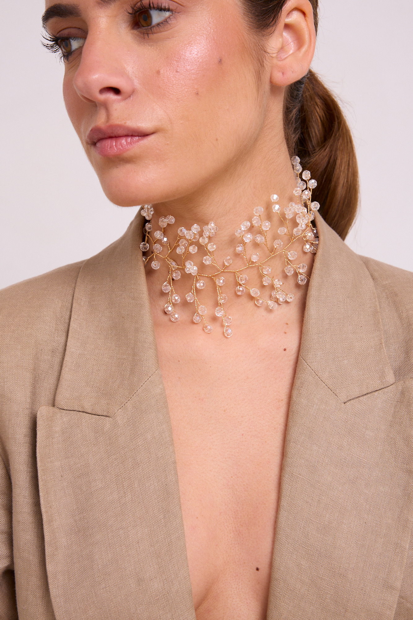 Chocker realizado artesanalmente con hilo de metal dorado y cuentas de cristal de color blanco.
