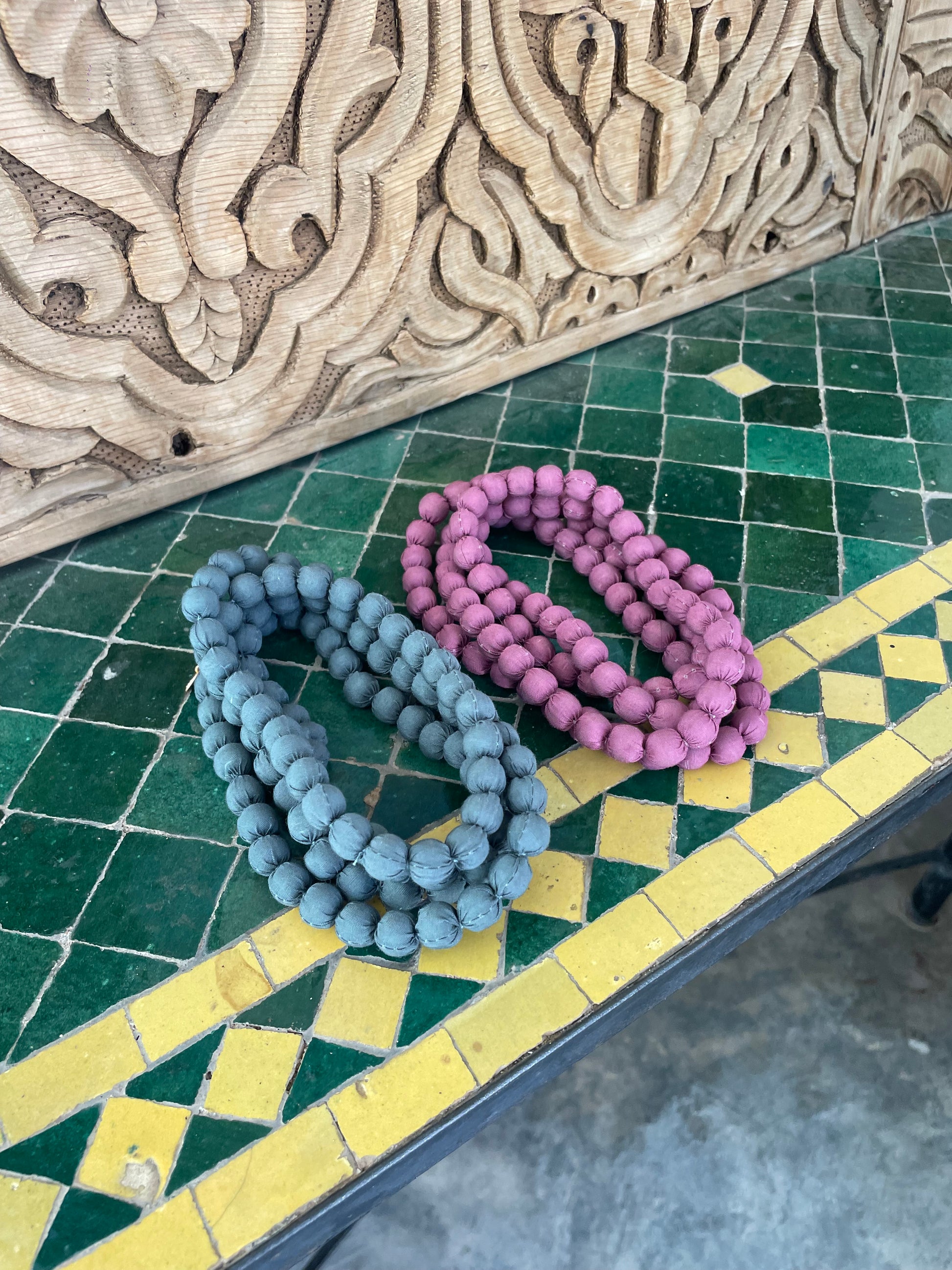 Collares multiposición de bolas de tela disponible en distintos colores.