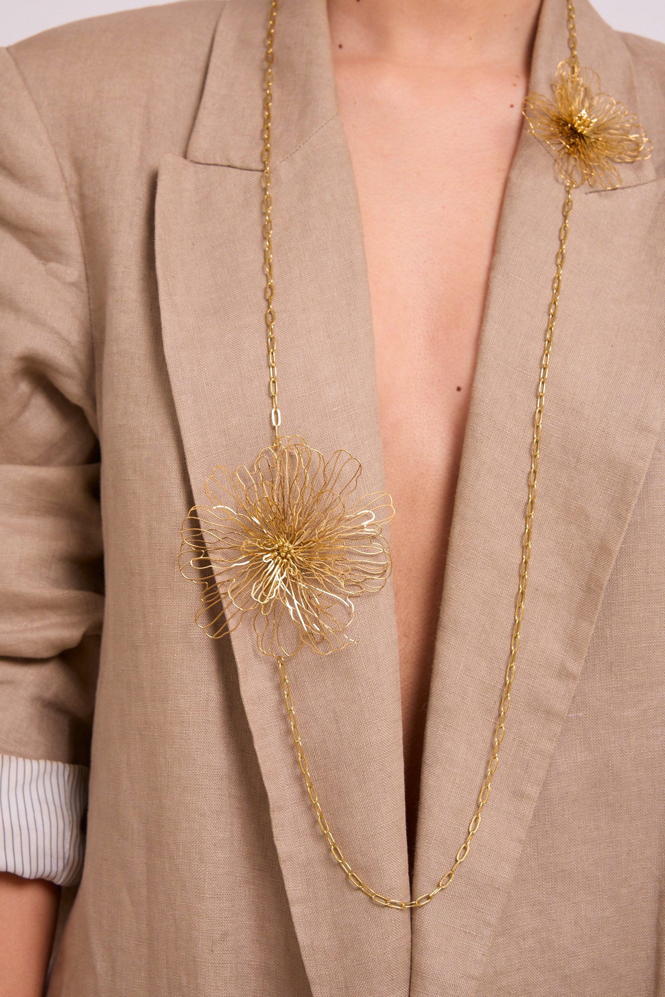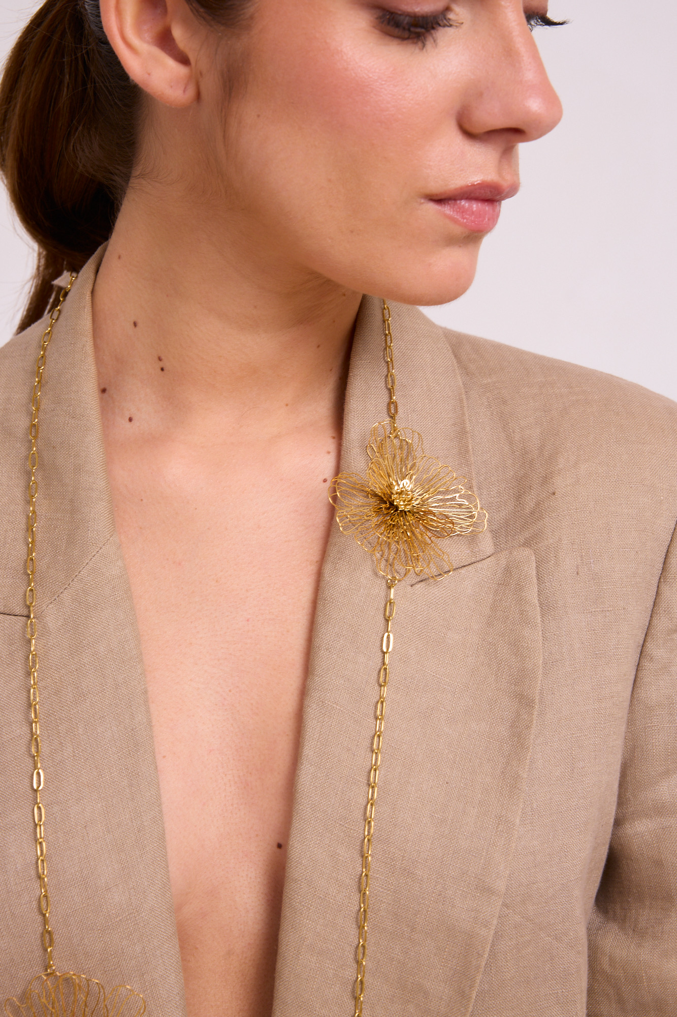 Colgante de eslabones y flores de filigrana en color dorado.