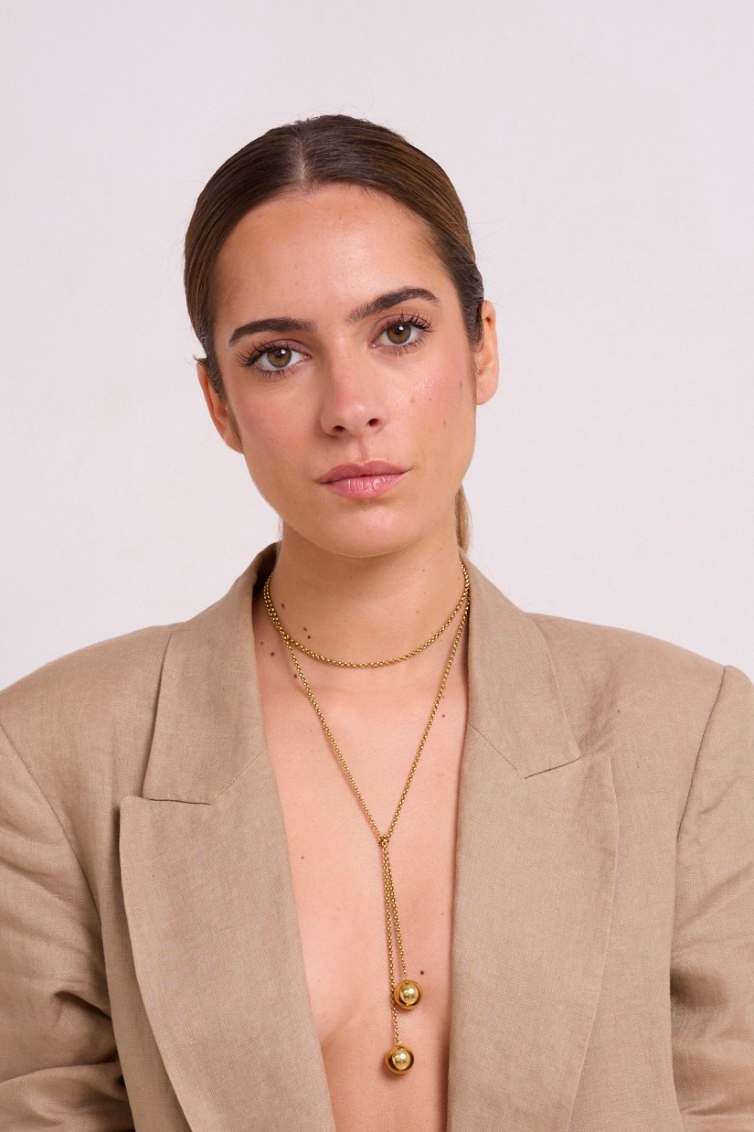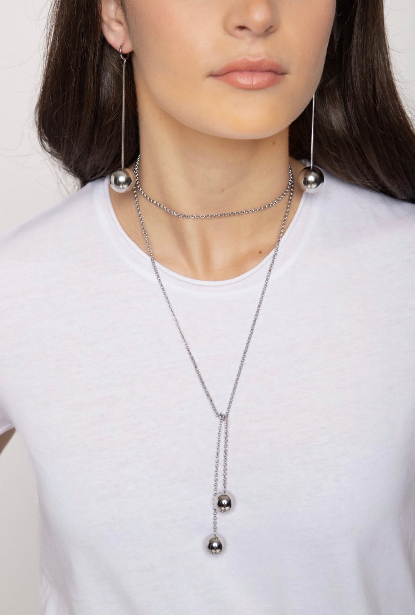 Collar de cadena multiposición con dos bolas colgantes disponible en dorado y plata.