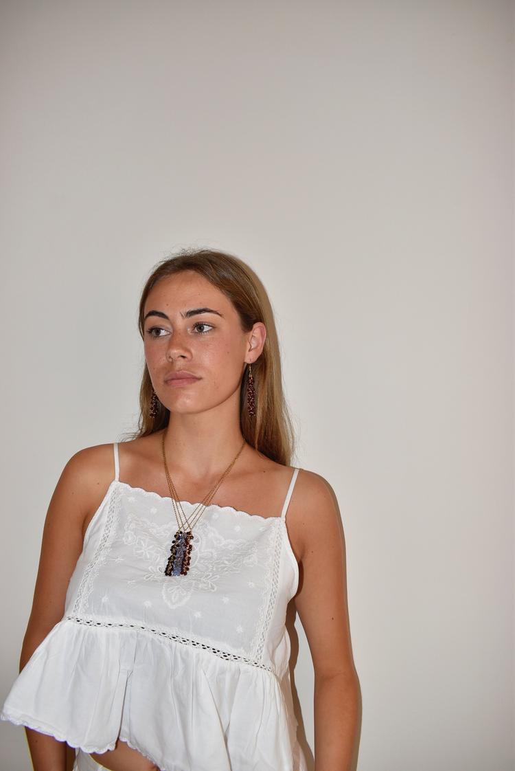 Collar largo con una cadena de acero inoxidable en tono dorado con una tira de bolitas en tonos negro, azul o granate.
