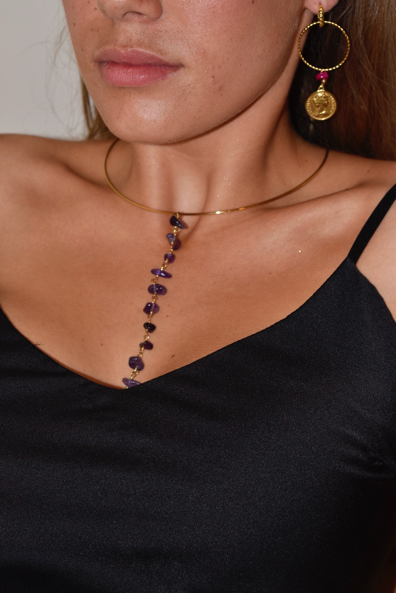 Chocker dorado de acero inoxidable con una tira de piedras naturales en tono morado.
