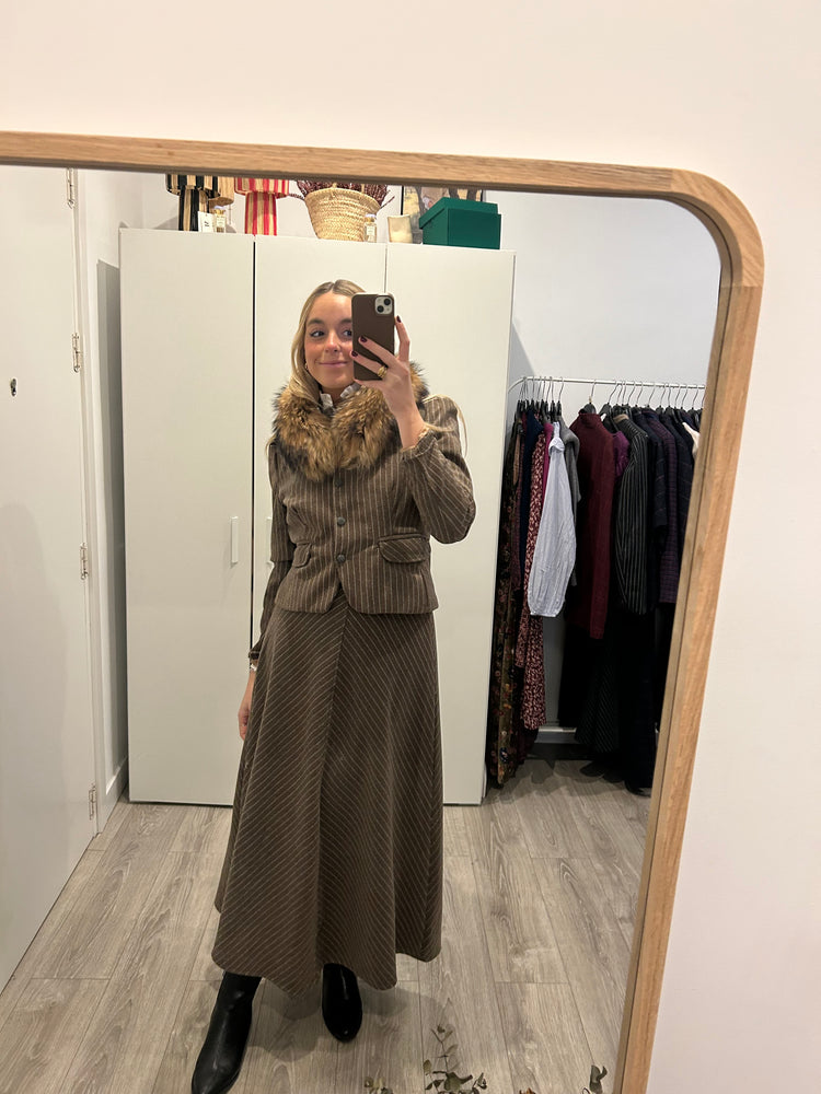 Falda larga de rayas en color grisáceo o marrón fluida.