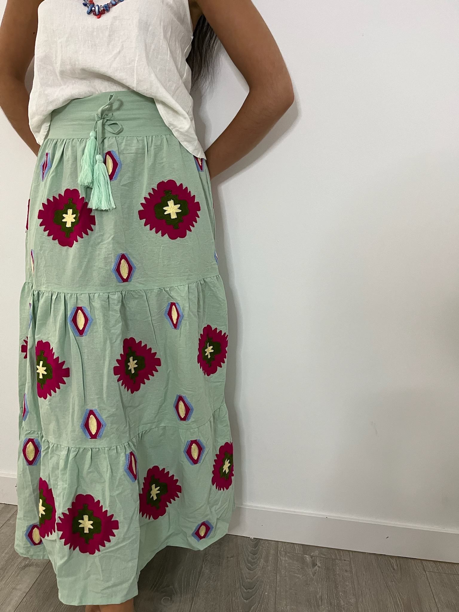 Falda con detalles bordados disponibles en distintos colores.