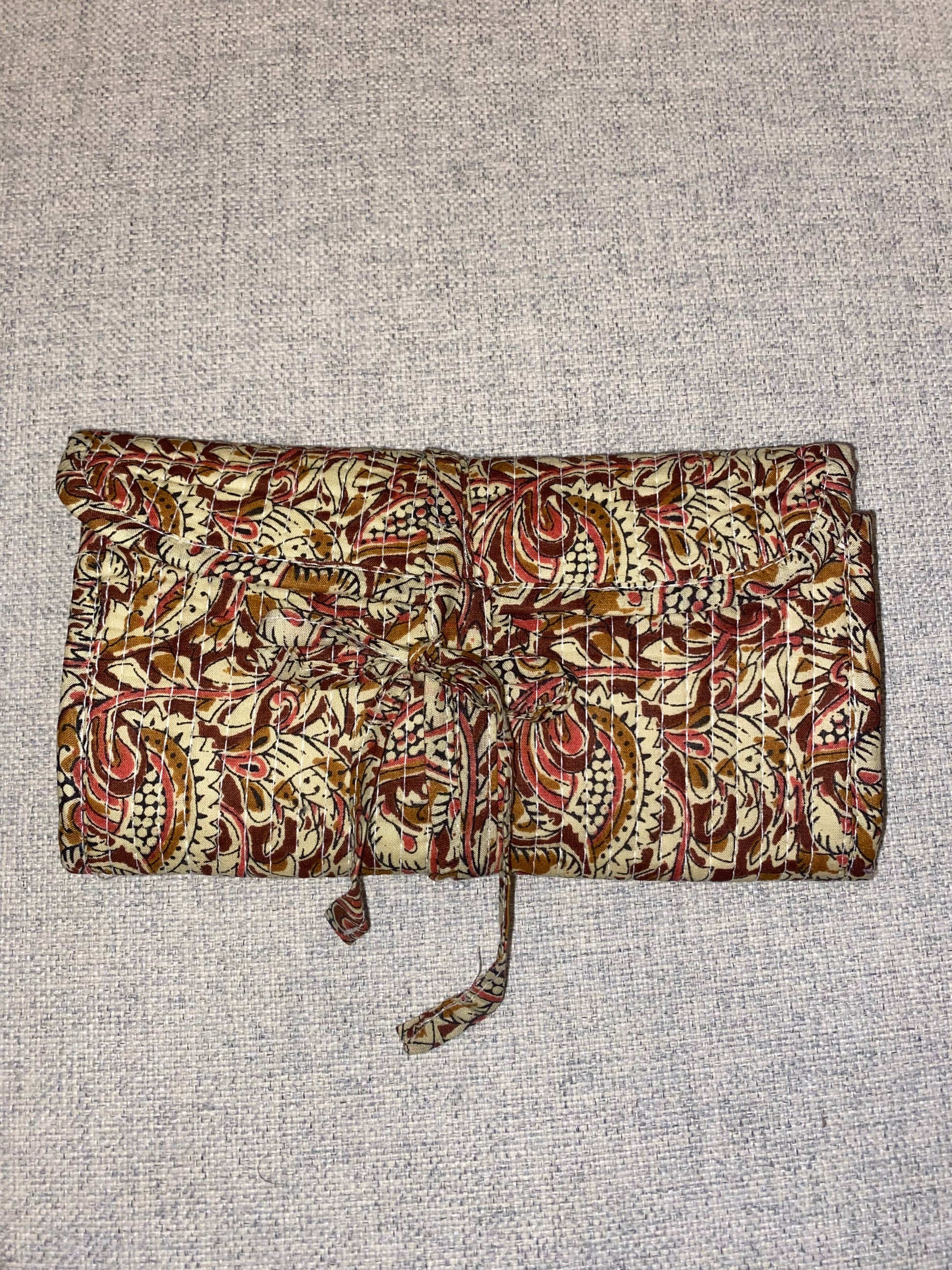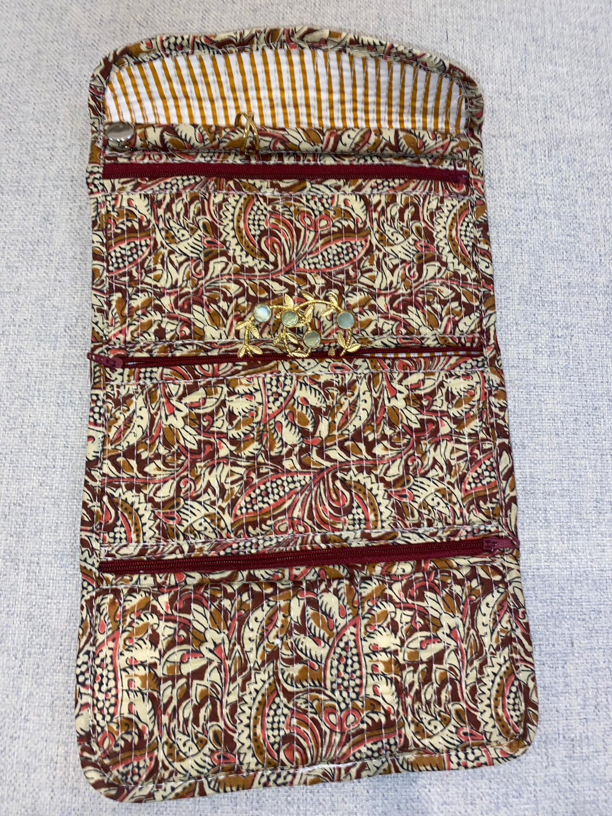 Joyero de viaje de algodón con estampado bordado. Tiene cierre mediante lazada, 3 bolsillos internos con cremallera y anillero.