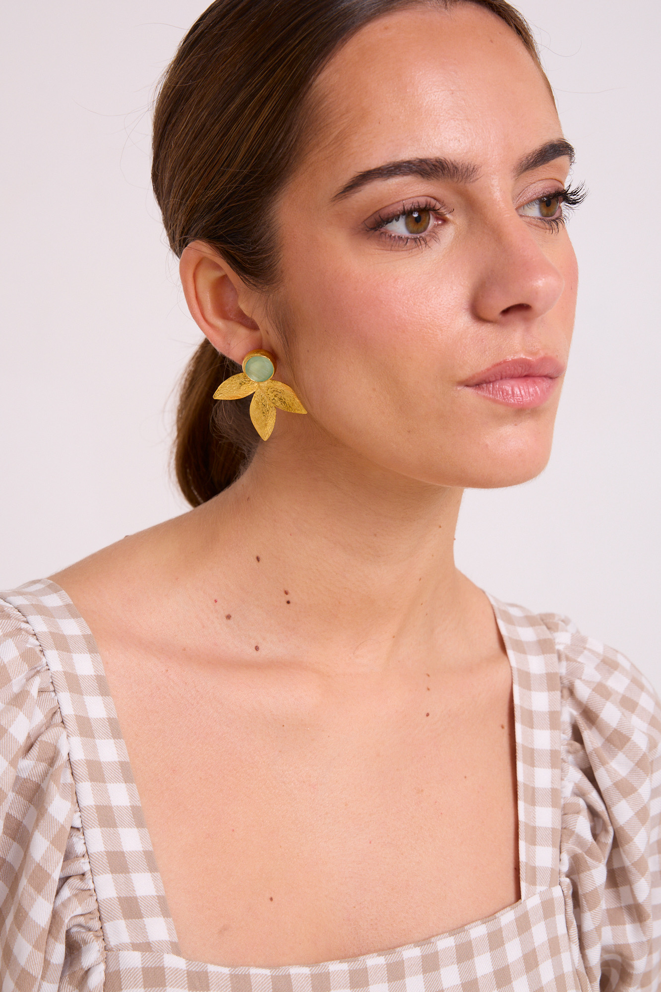 Pendientes en forma de hoja y piedra natural disponibles en varias tonalidades.