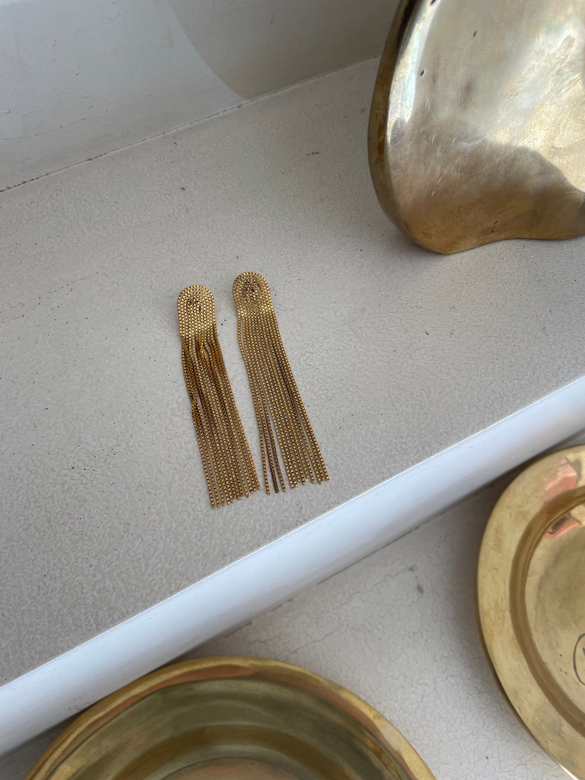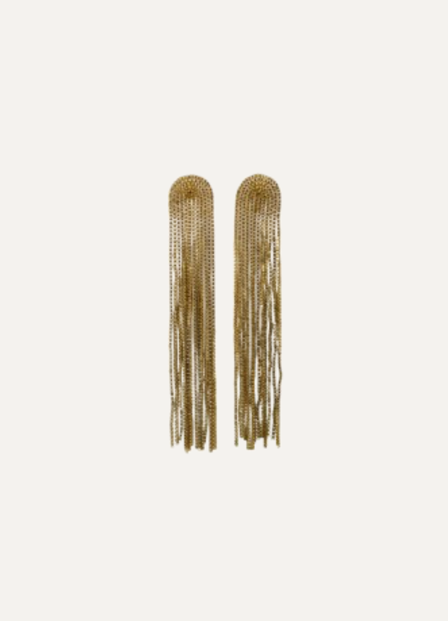 Pendientes largos en color dorado con un diseño estilizado y líbero que aporta movimiento.