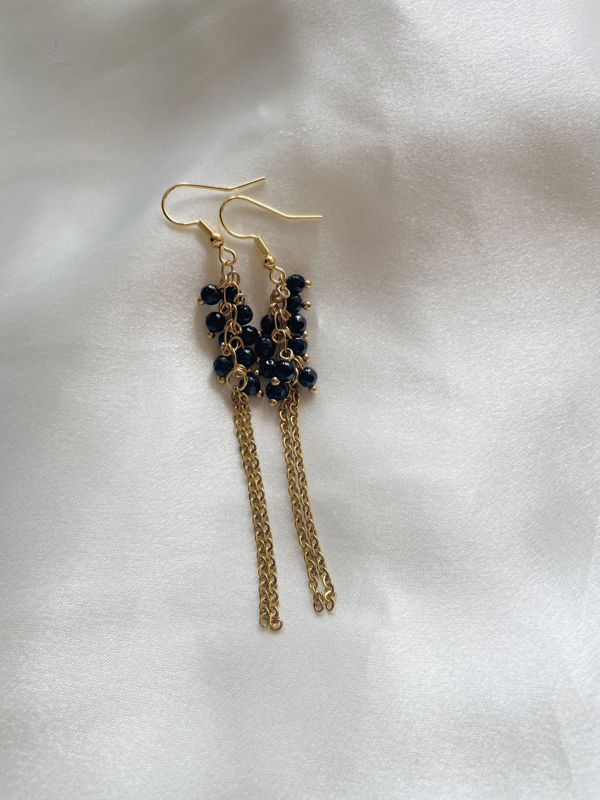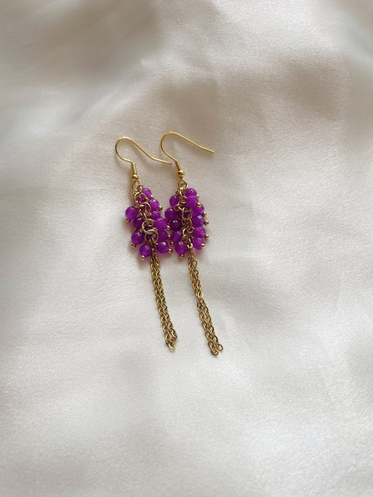 Pendientes con una tira de bolitas en tonos rosa, azul o granate y una cadena dorada.
