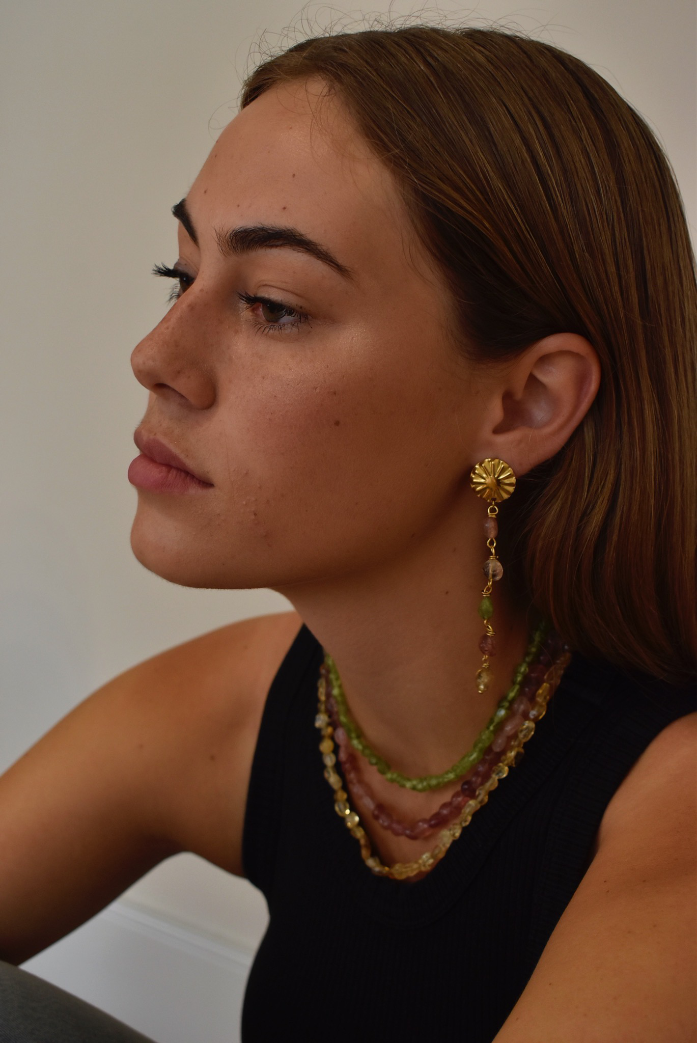 Pendientes tipo cascada, con enganche en forma de flor y piedras naturales multicolor.