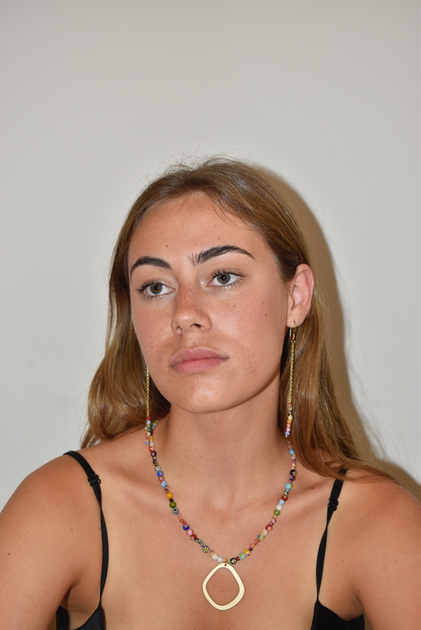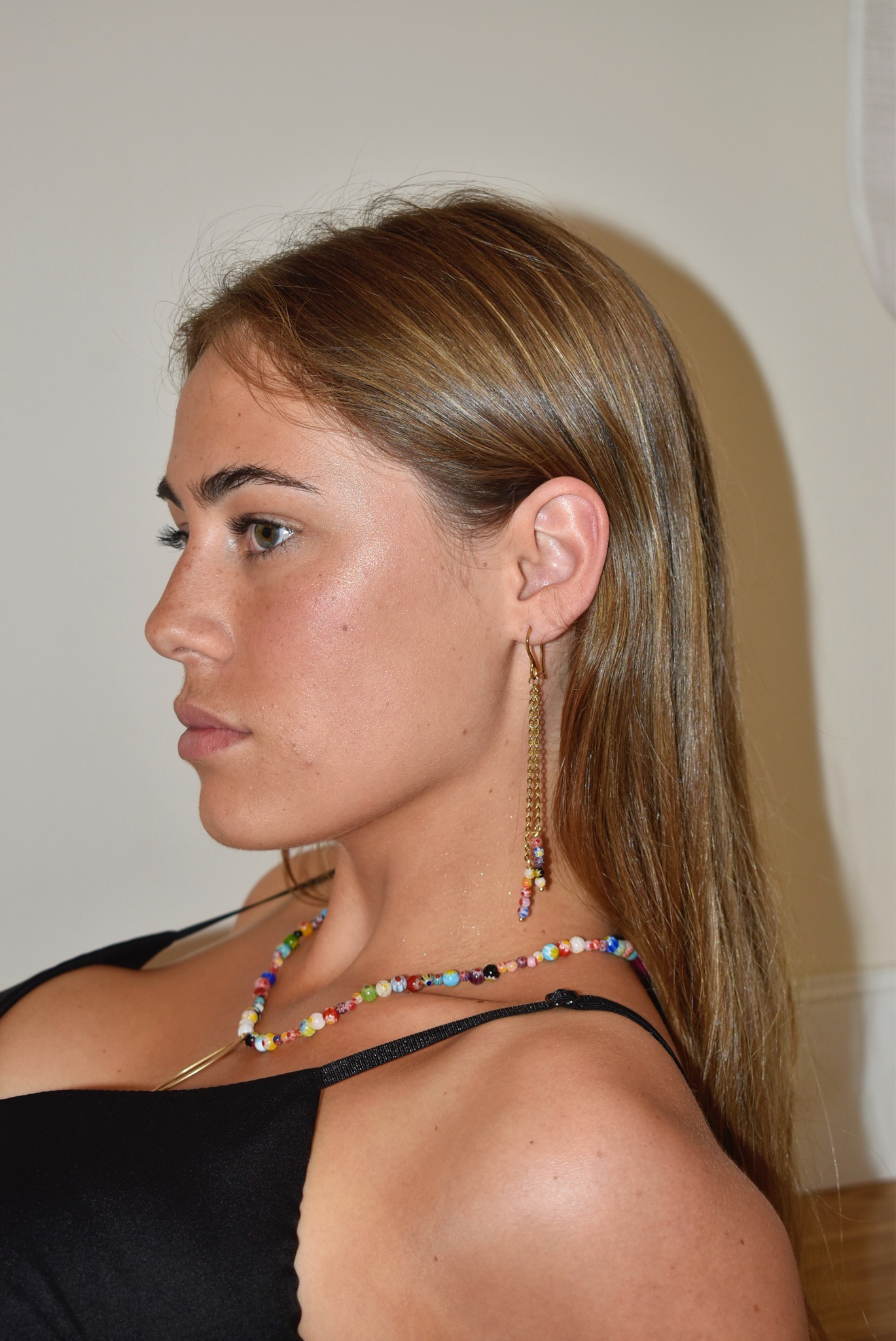 Pendientes a desnivel con bolas multicolor de diversas formas y texturas.