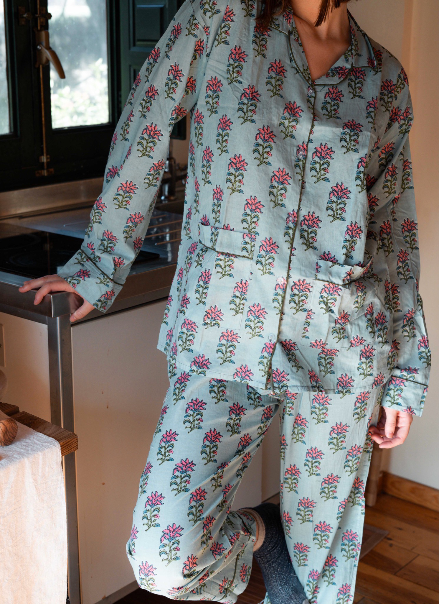 Pijama largo con bata de algodón con estampado hecho a mano mediante la técnica de Block Print.