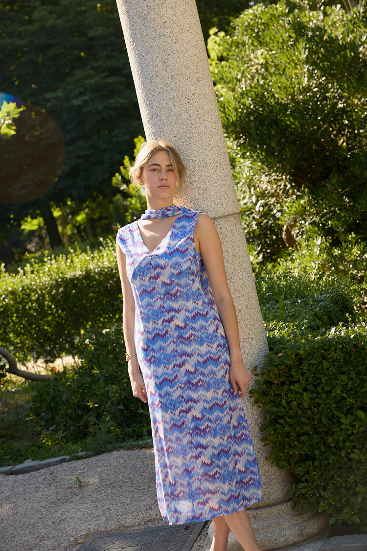 Vestido estampado midi de cuello redondo con una tira anudada al cuello ideal para una ocasión especial.